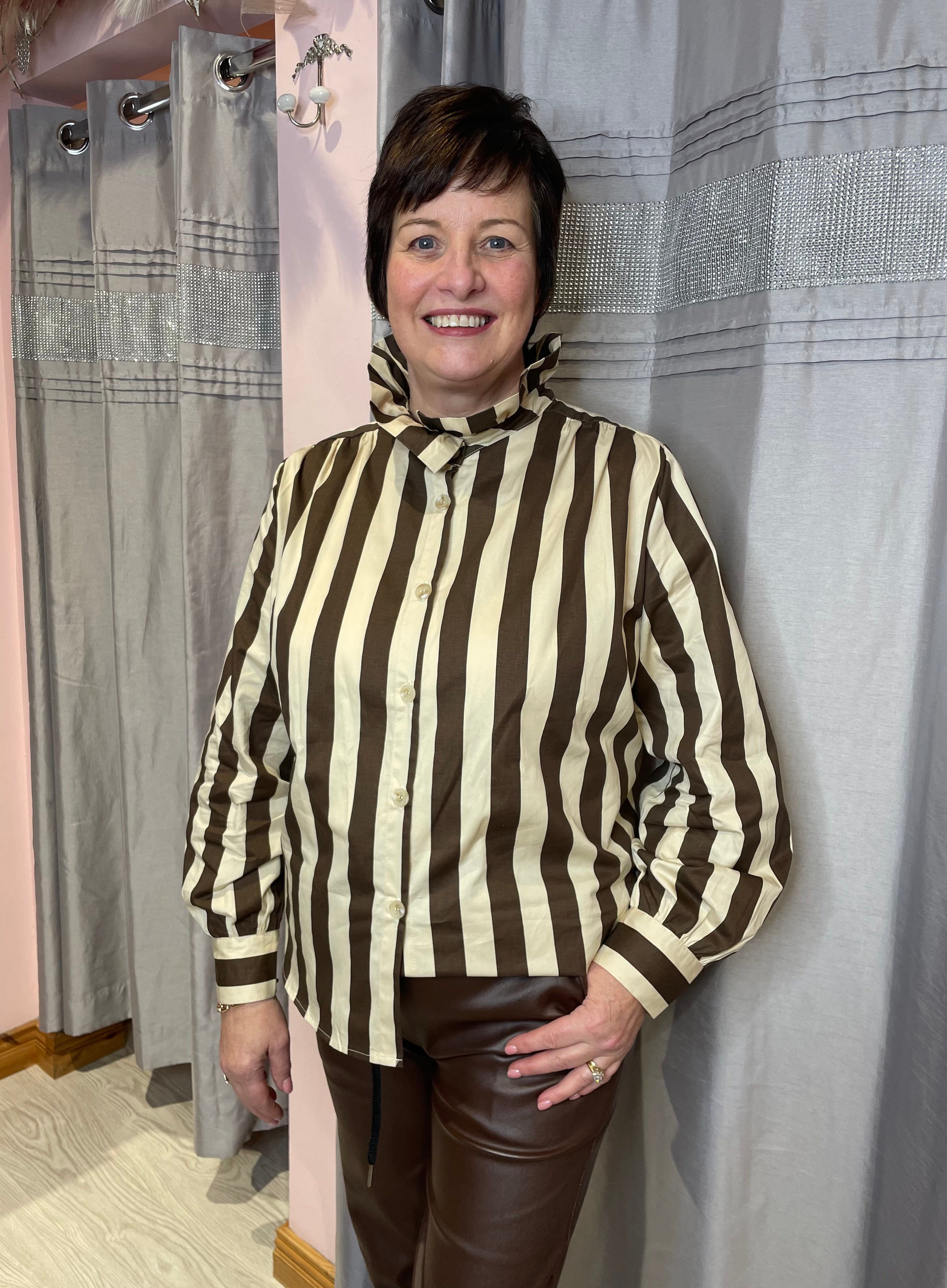 Crisp stripes meet soft feminine detailing. Designed with a subtle fluted collar and a relaxed fit for an easy, modern look.