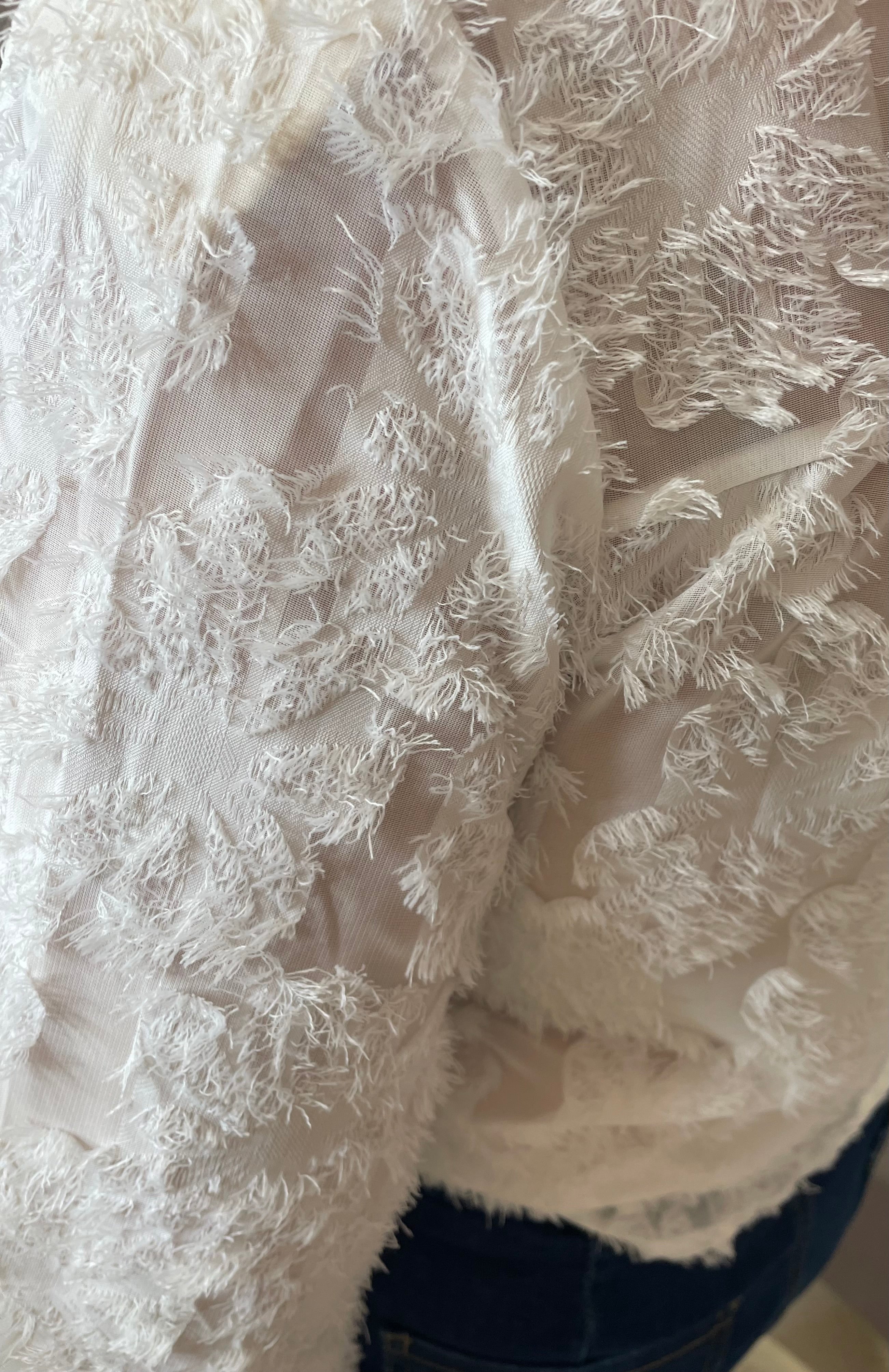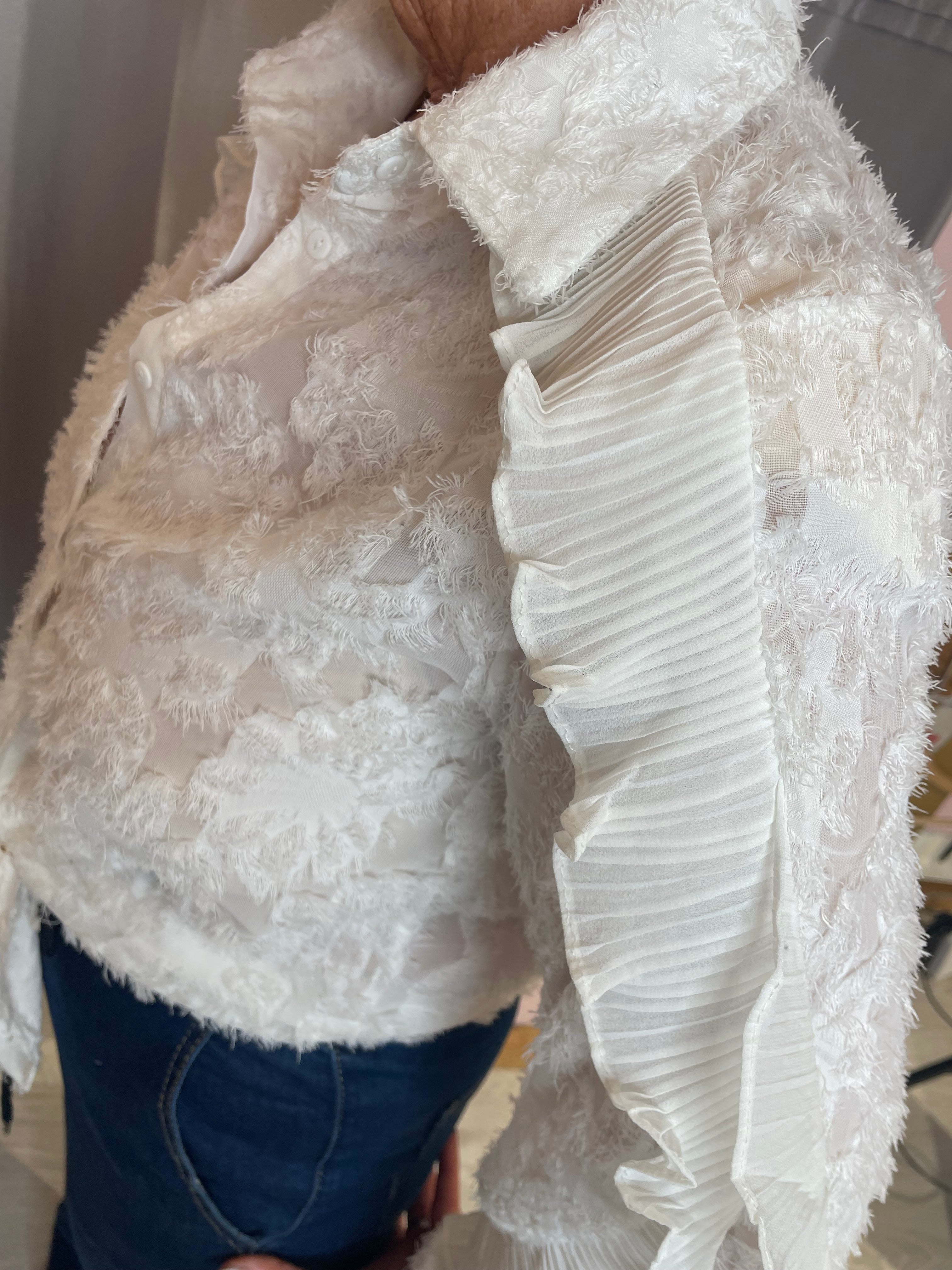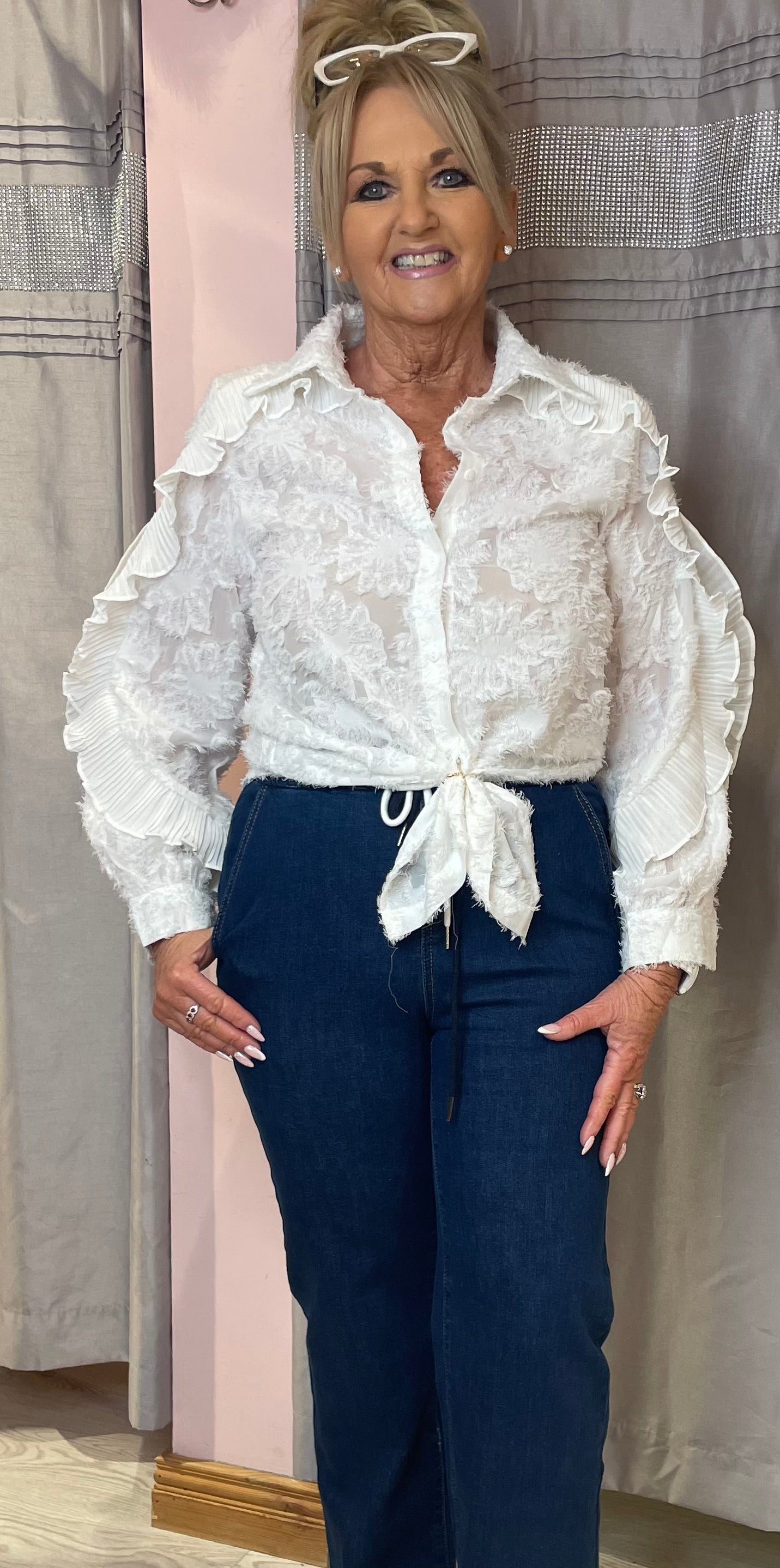 Turn heads in this stunning new women’s blouse, designed with exquisite attention to detail. Soft ruffled accents create movement and femininity, while intricate eyelash lace appliqués add a luxurious, romantic touch.