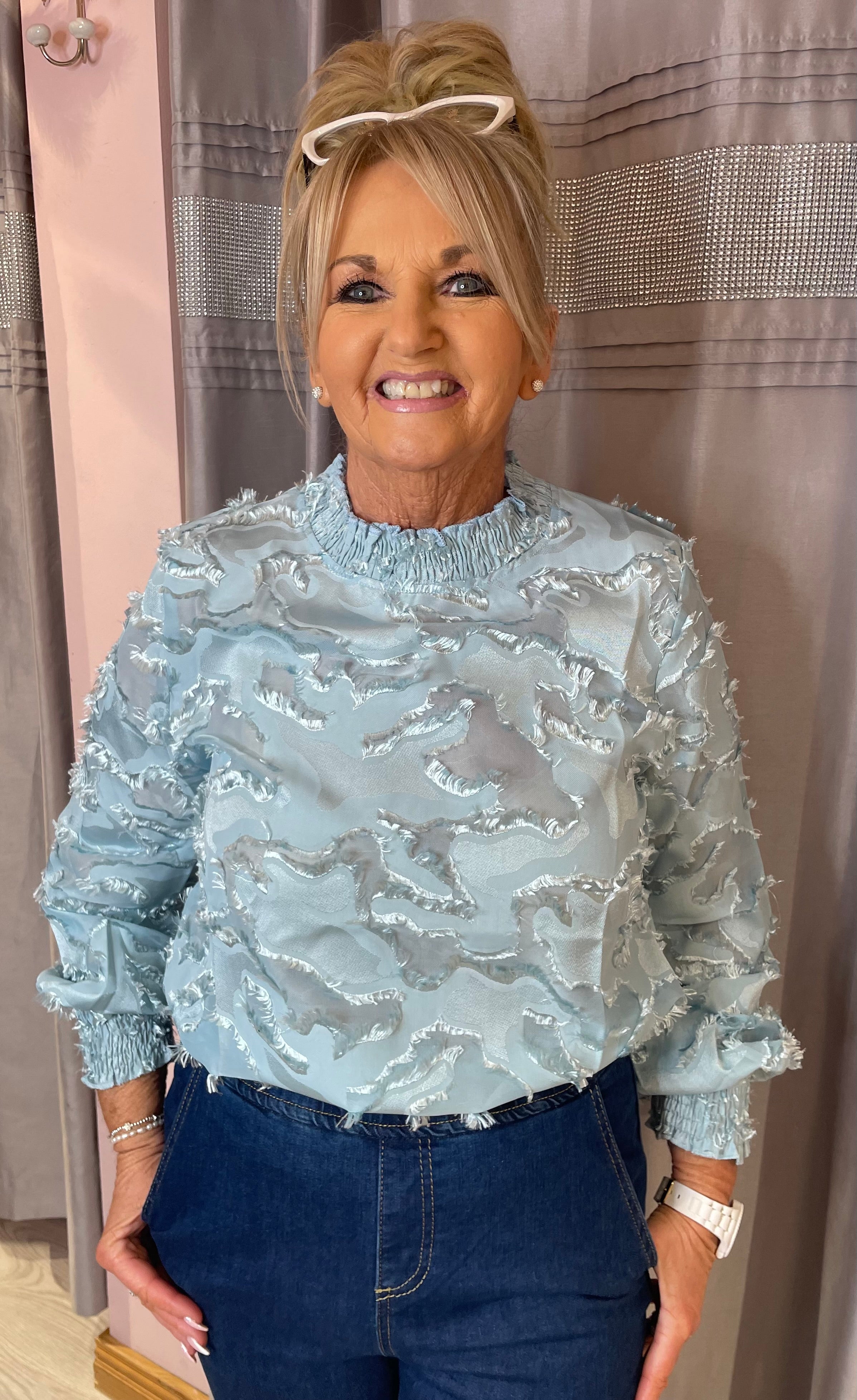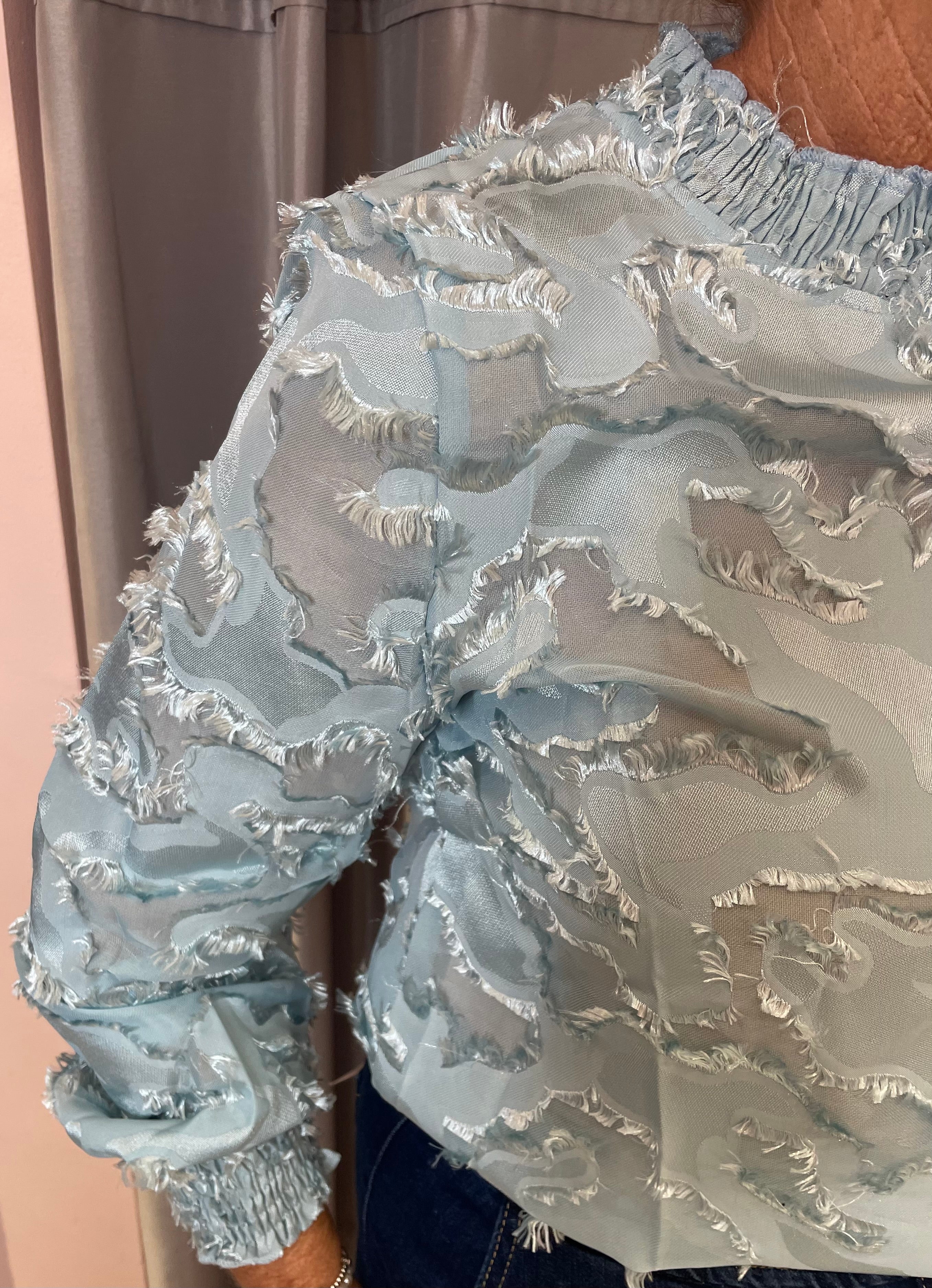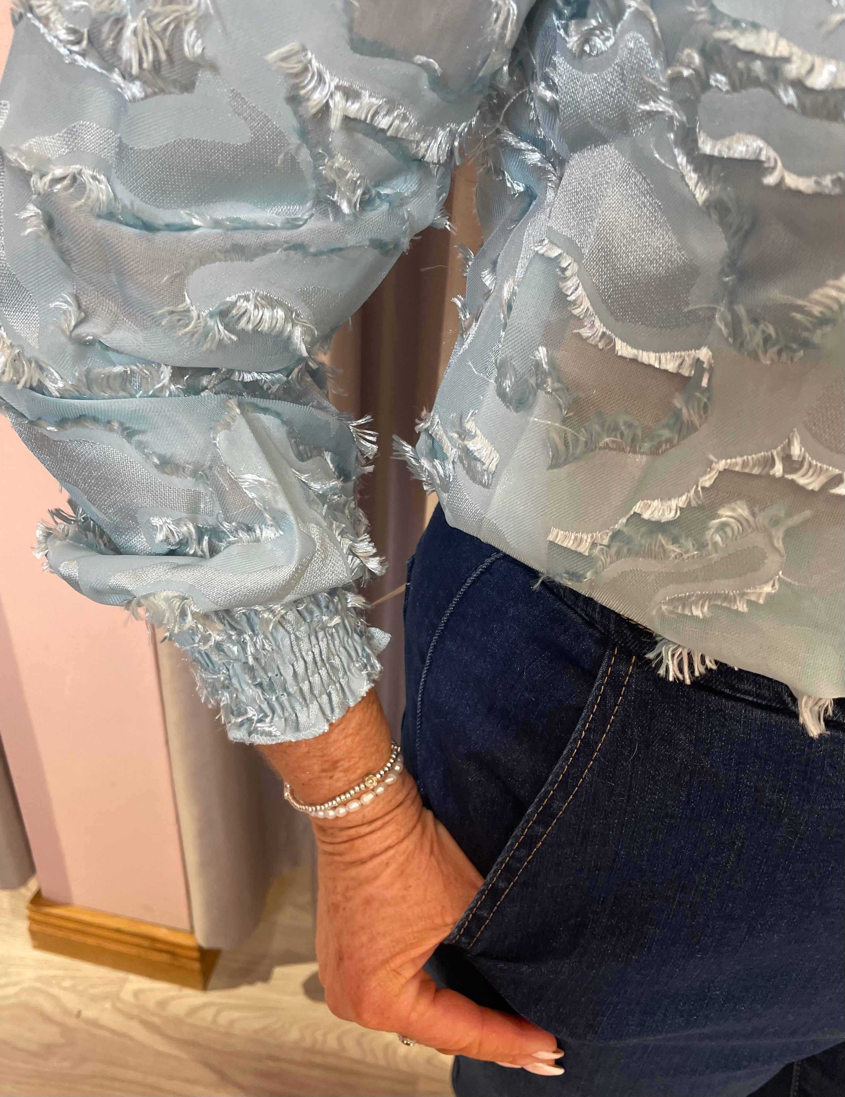 Elevate your everyday wardrobe with this effortlessly romantic burnout blouse. Designed with a high ruffled neckline and sheer burnout texture, it brings soft drama to both casual and dressed-up looks. Long sleeves finish with elasticated cuffs for a comfortable, flattering fit, making it easy to wear from day to night.