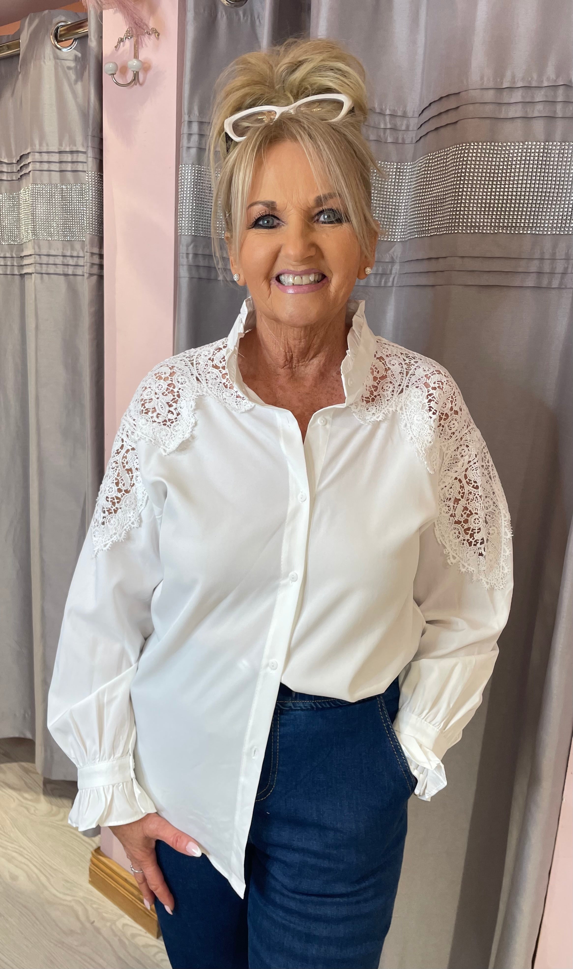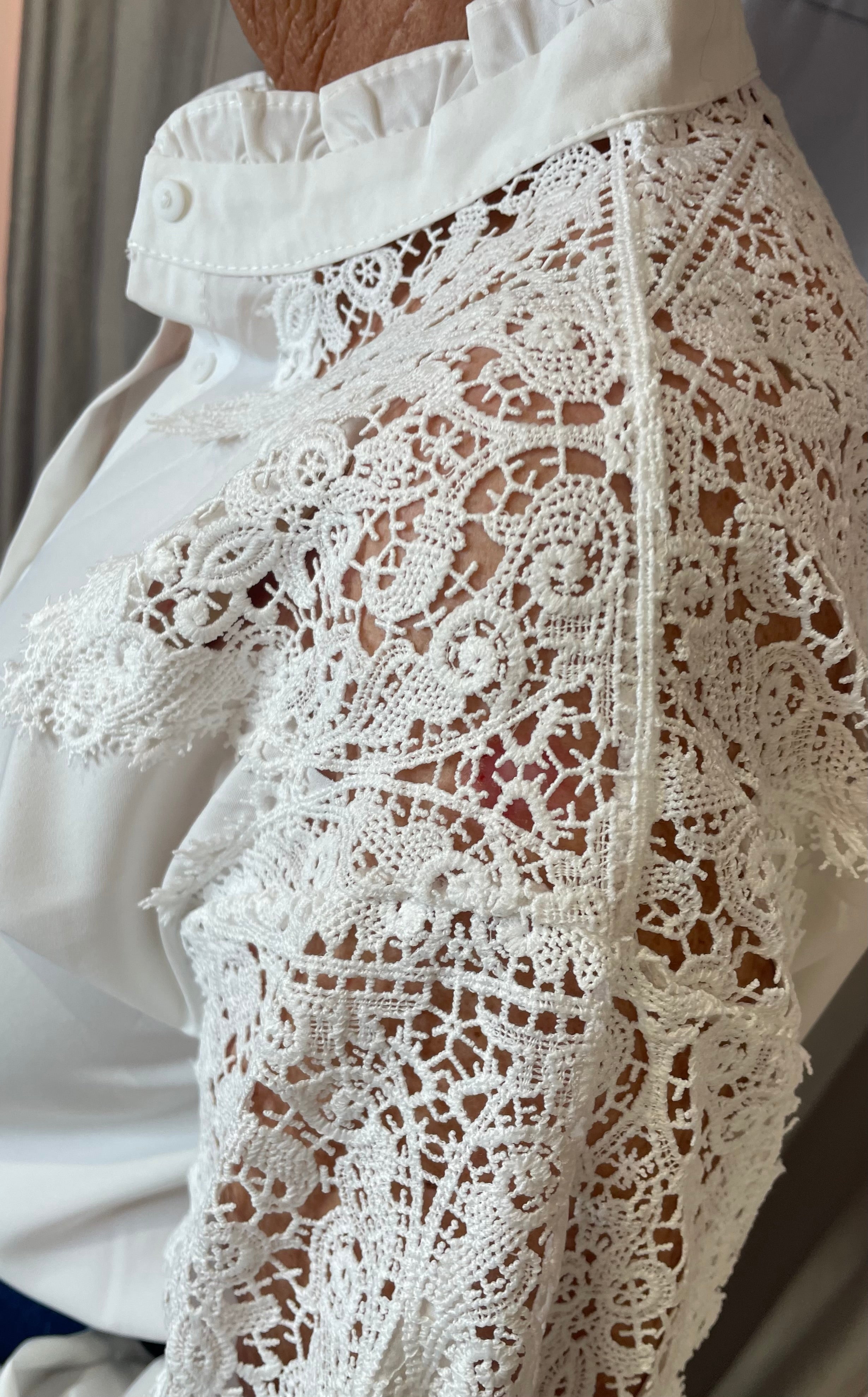 Delicate and elegant, this blouse features a high ruffled neckline and intricate openwork lace detailing. Long sleeves are finished with ruffled cuffs, adding a romantic touch and subtle volume. Lightweight and refined, it’s perfect for elevating both tailored looks and everyday outfits.