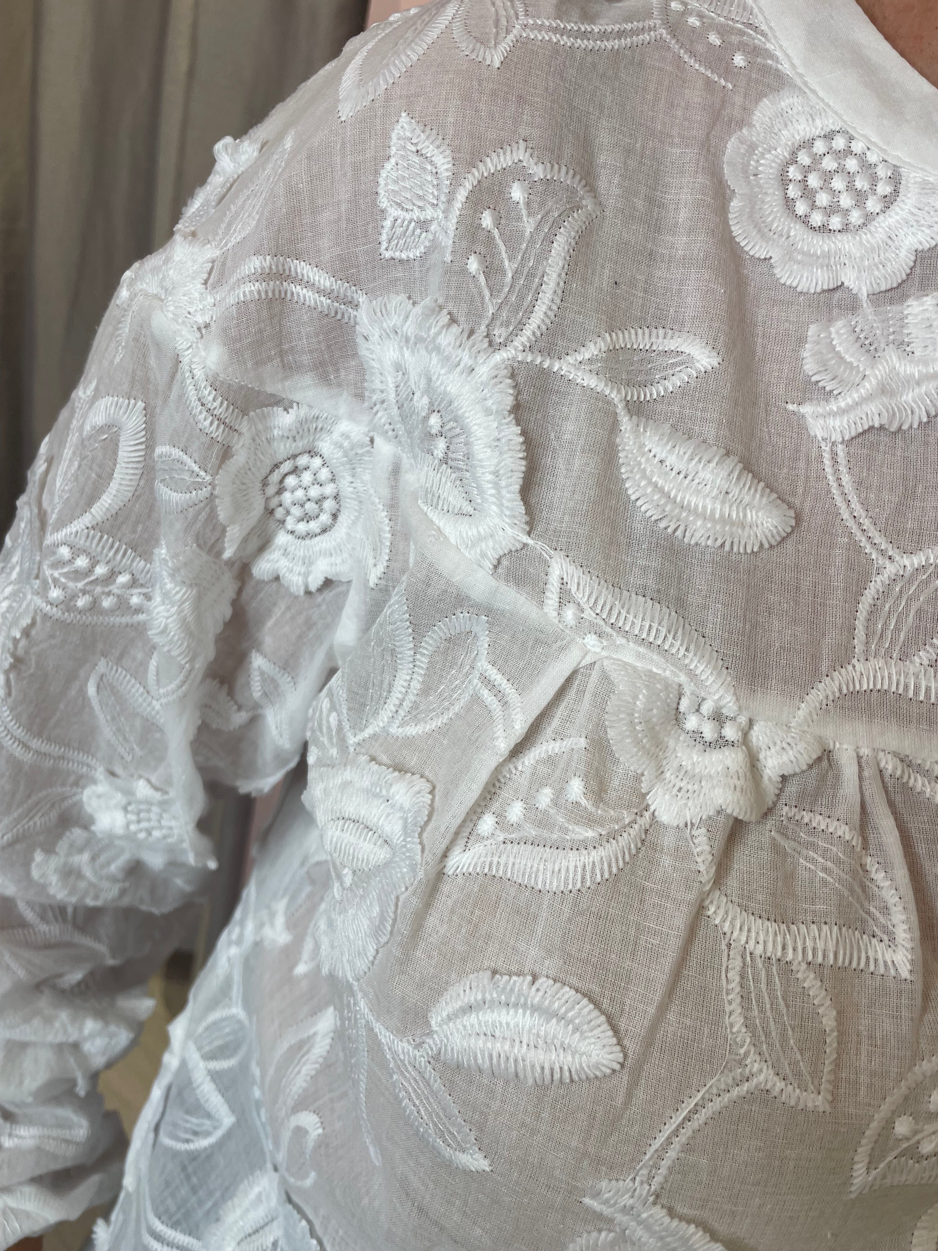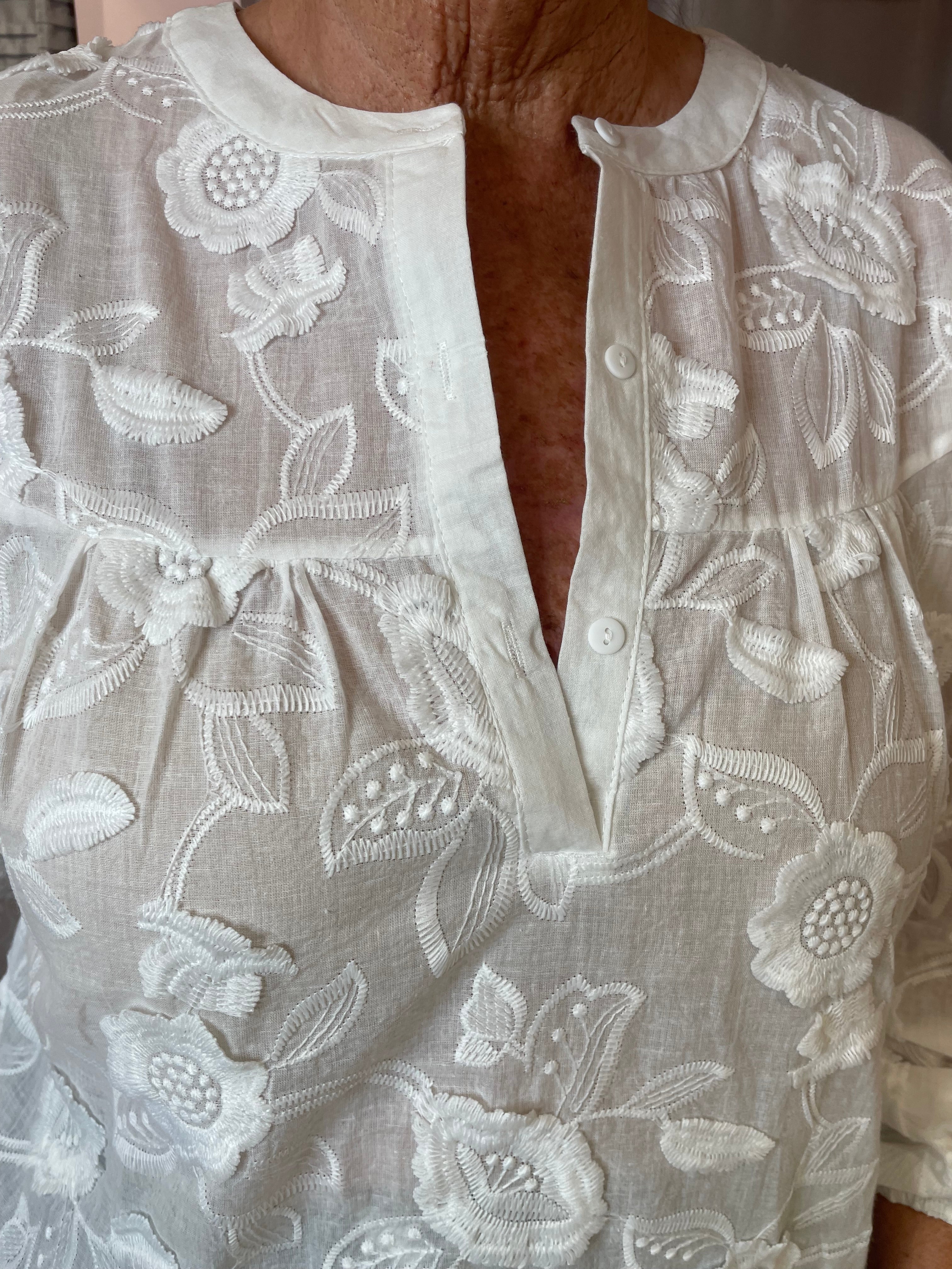 Elevate your everyday wardrobe with this embroidered blouse, featuring delicate detailing and a classic silhouette. A round neckline and long sleeves create a timeless shape, while the button placket adds a touch of tailored sophistication. Perfect for pairing with jeans, skirts, or tailored trousers.