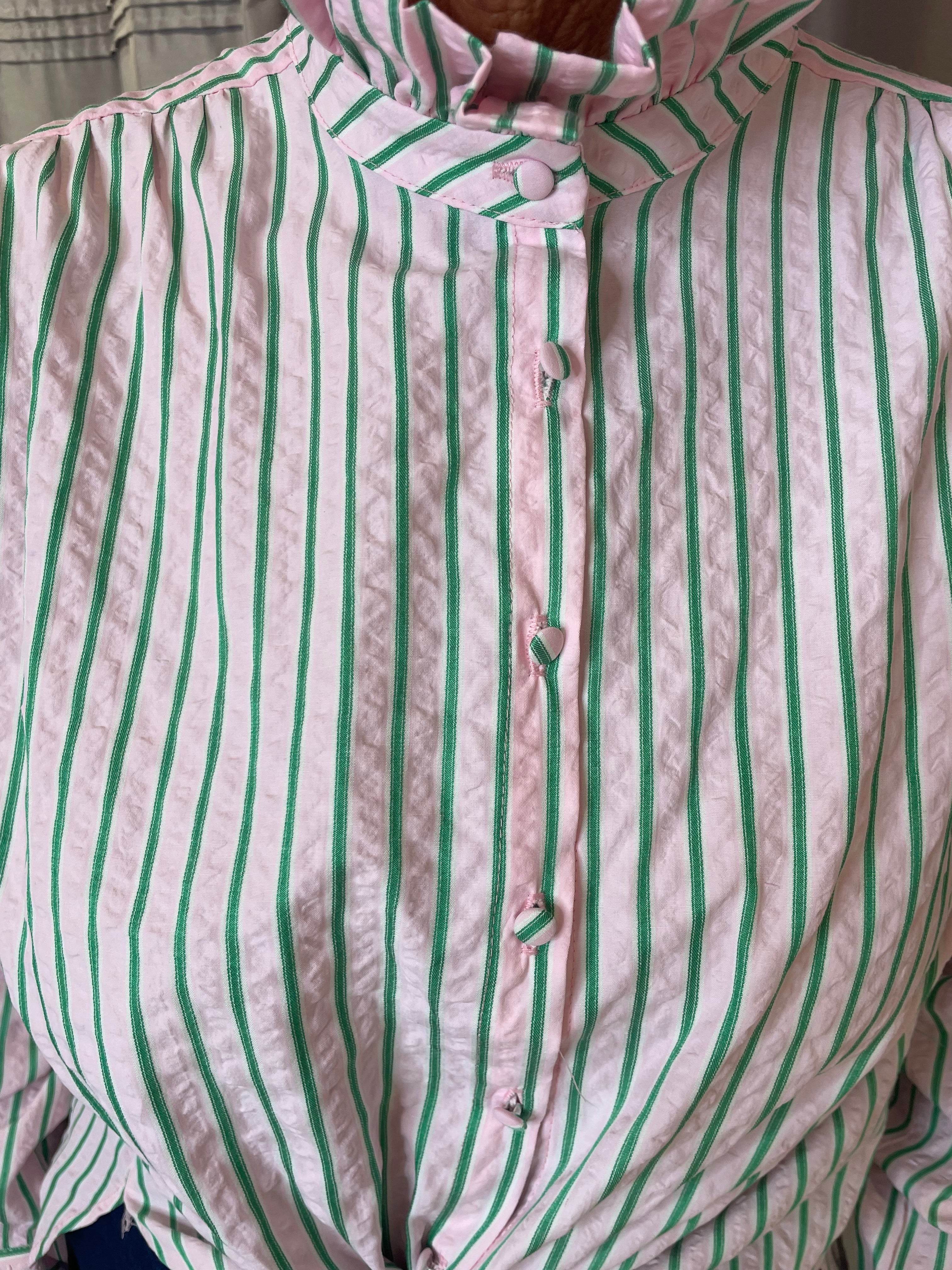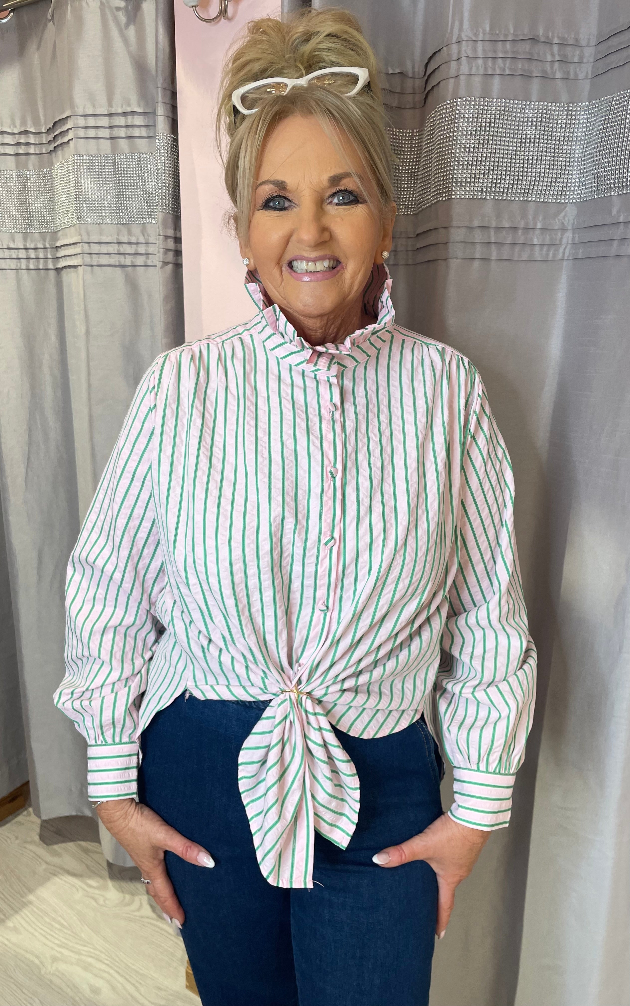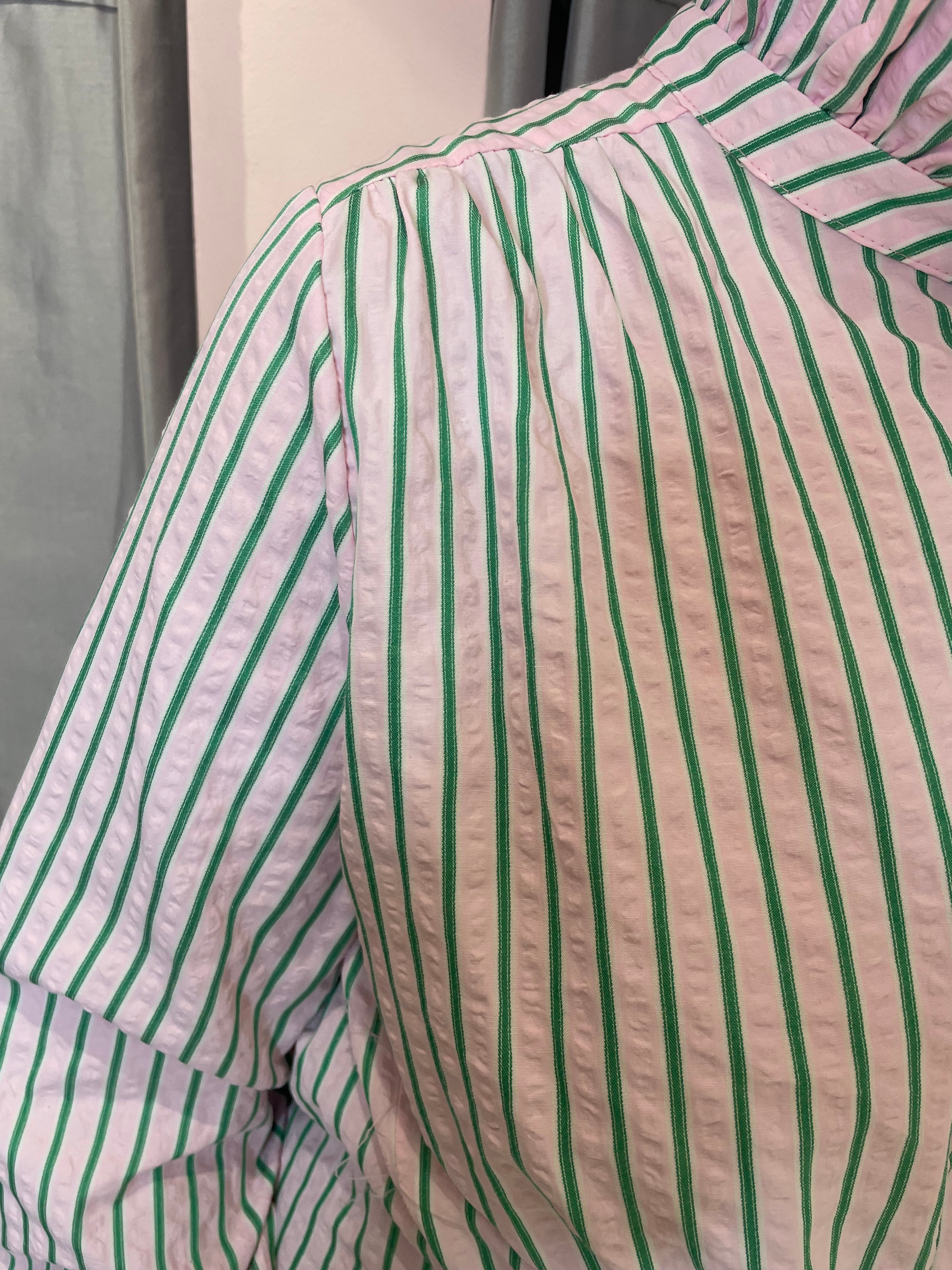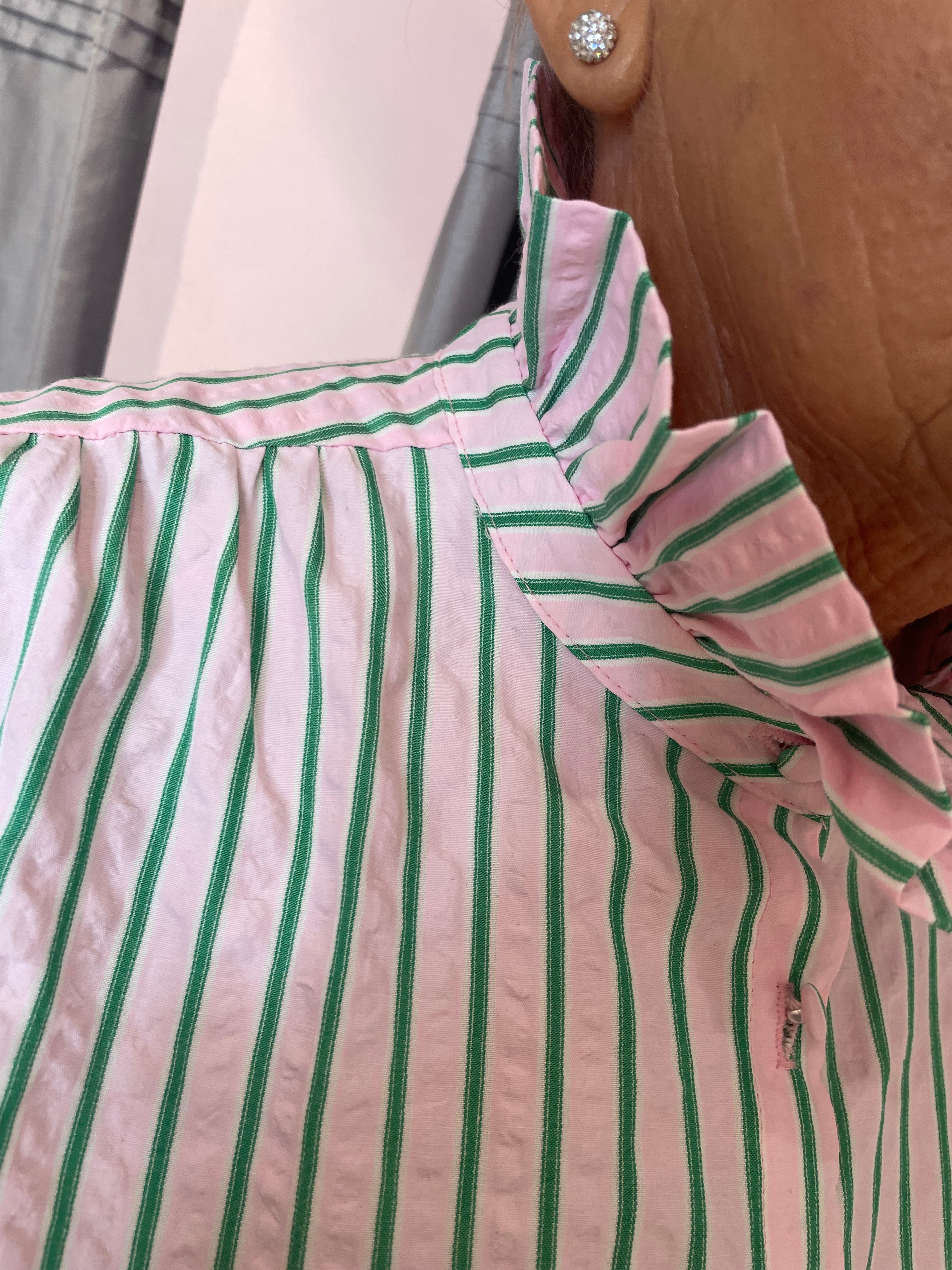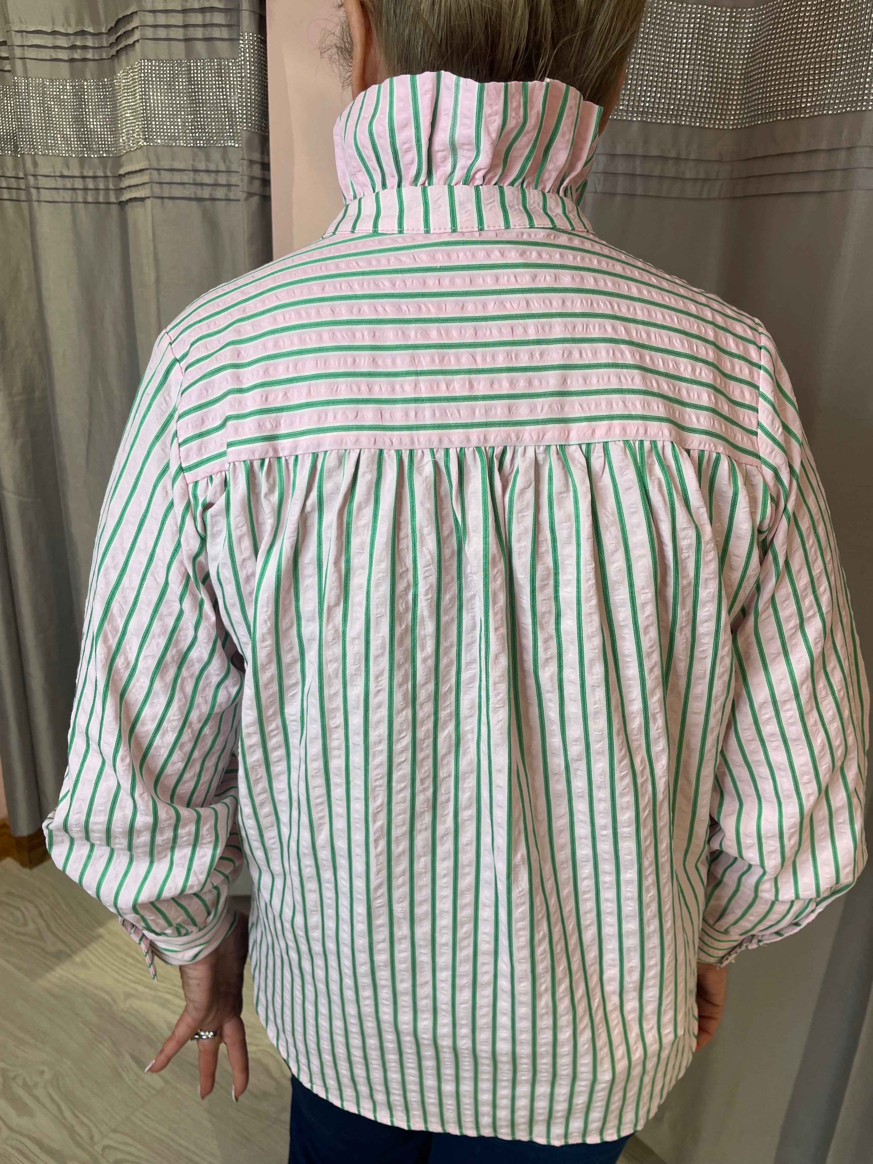 Effortless elegance meets relaxed style. This seersucker oversized shirt features a high ruffle collar, long sleeves, and a dipped hem, making it the perfect statement piece for layering or wearing on its own.
