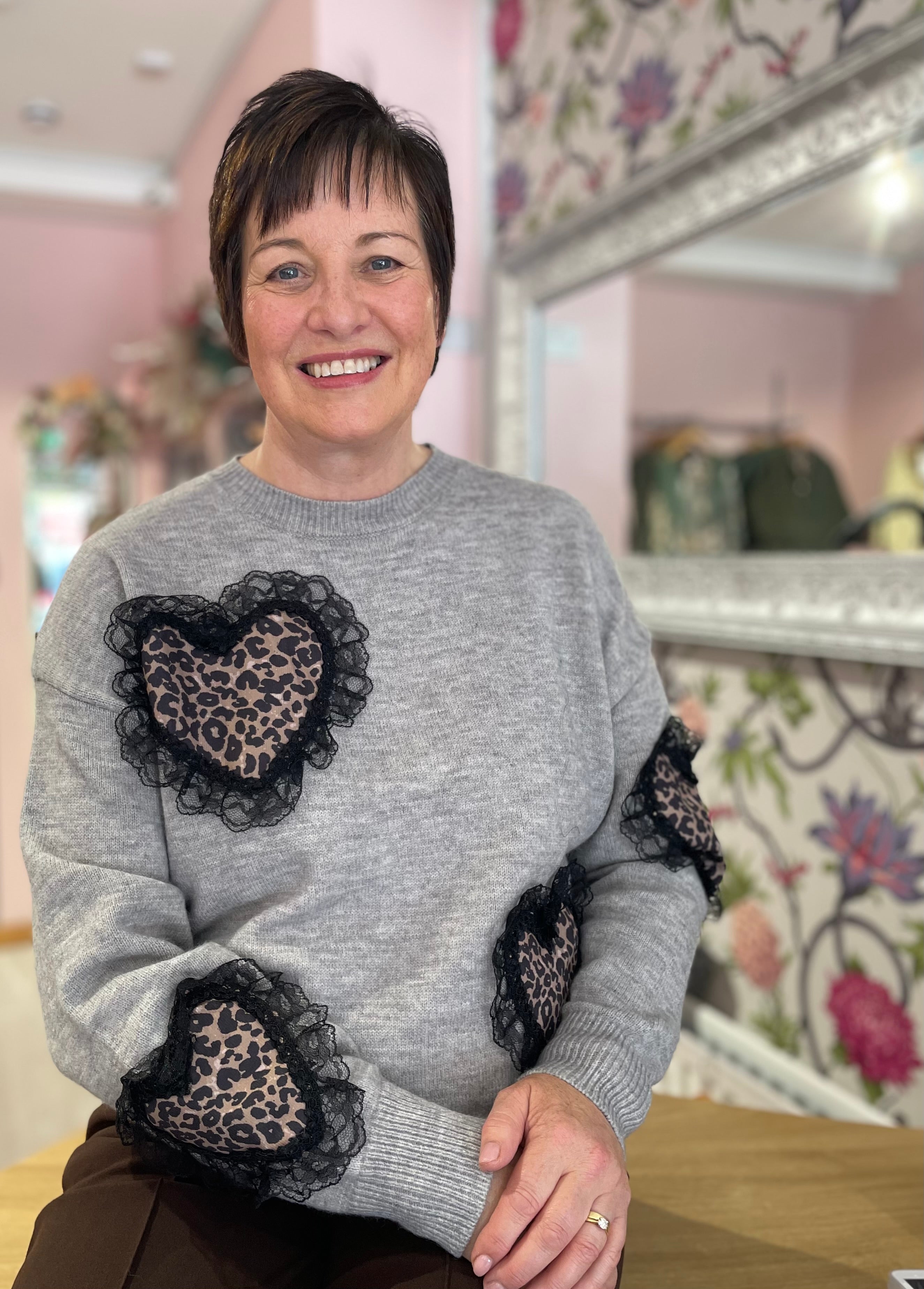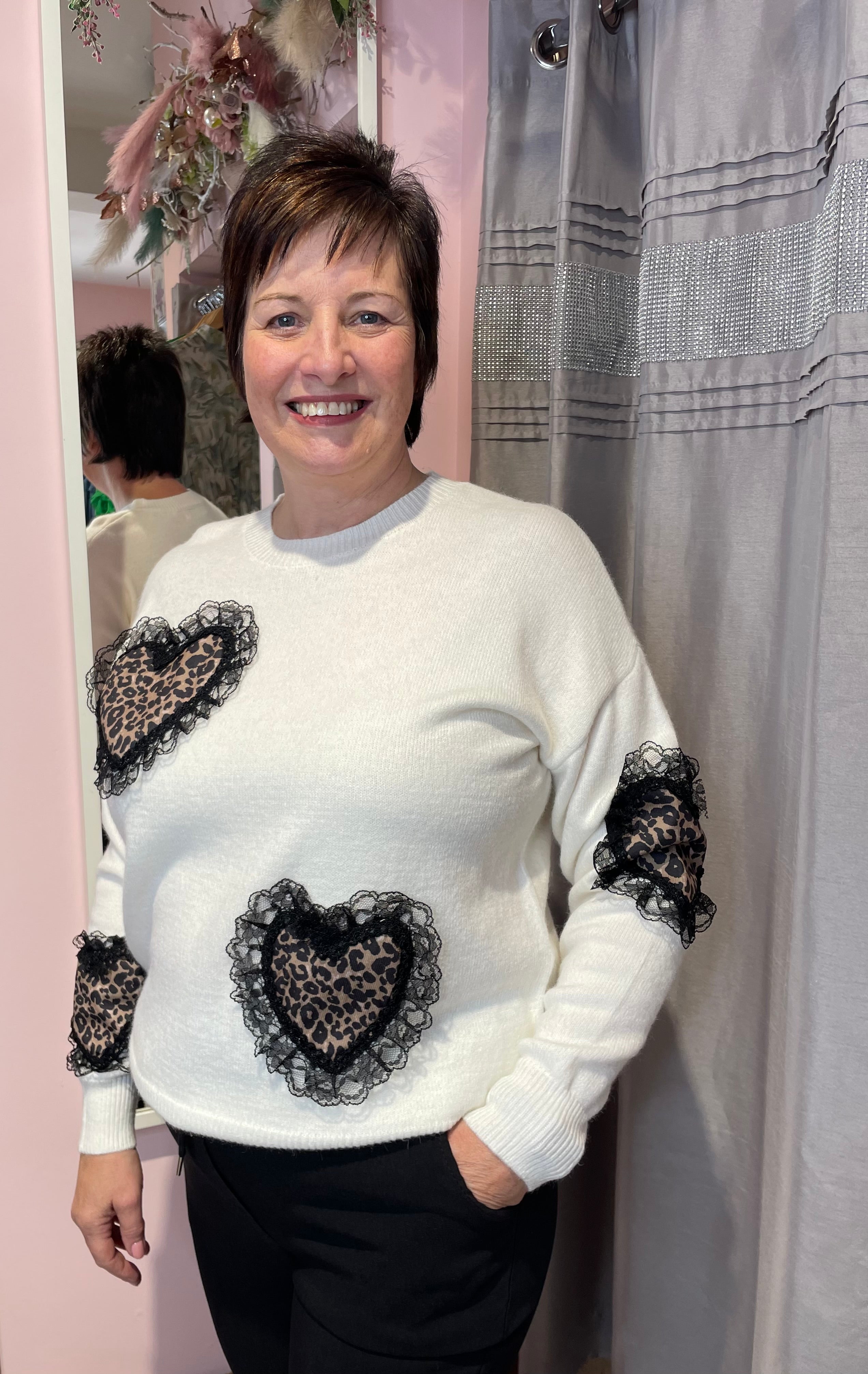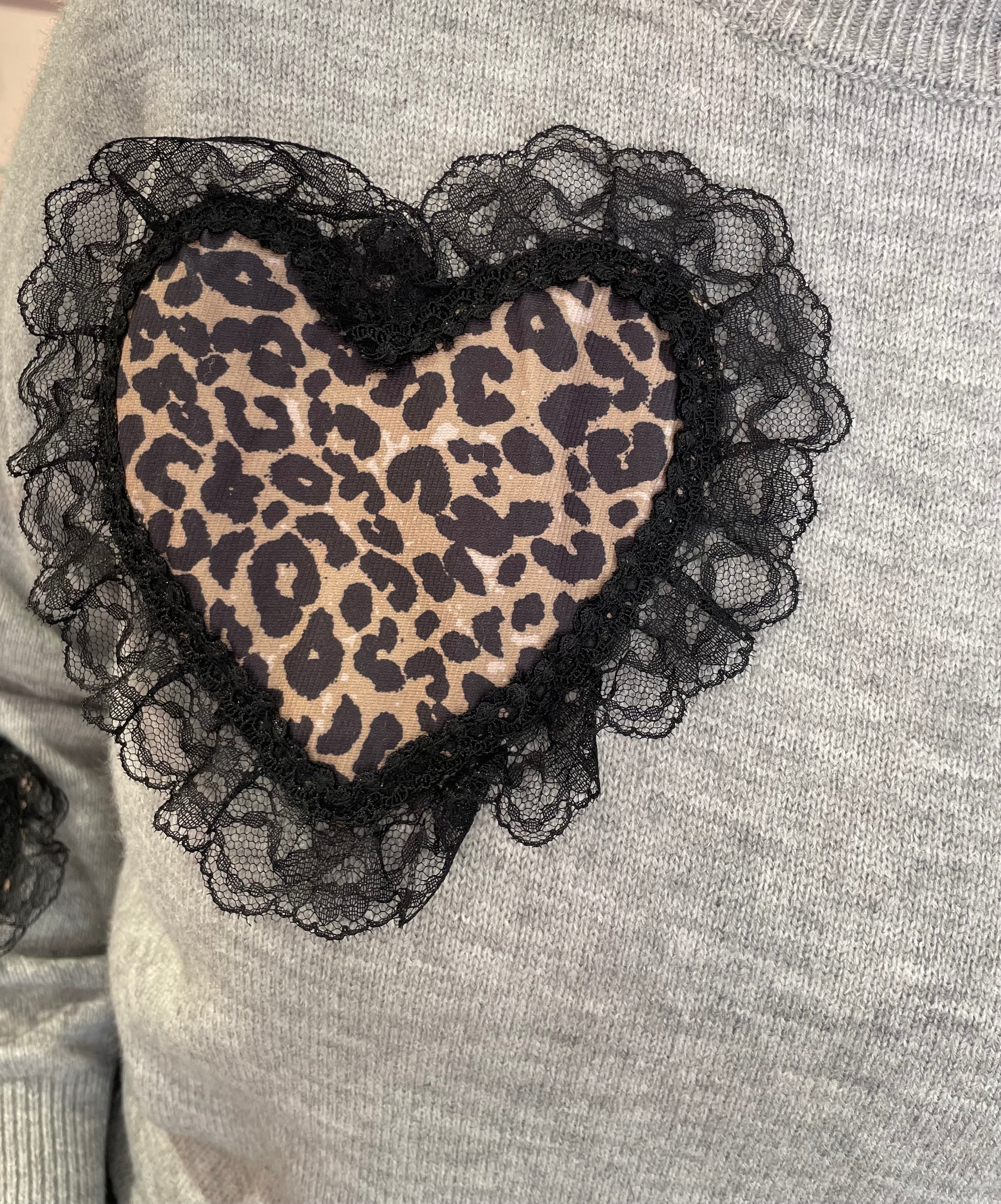Elevate your knitwear collection with this Crew Neck Sweater, a perfect balance of softness and statement detail. Crafted in a fine-knit base, the classic silhouette is reimagined with delicate lace accents and bold leopard-print embellishment for a striking contrast of textures.