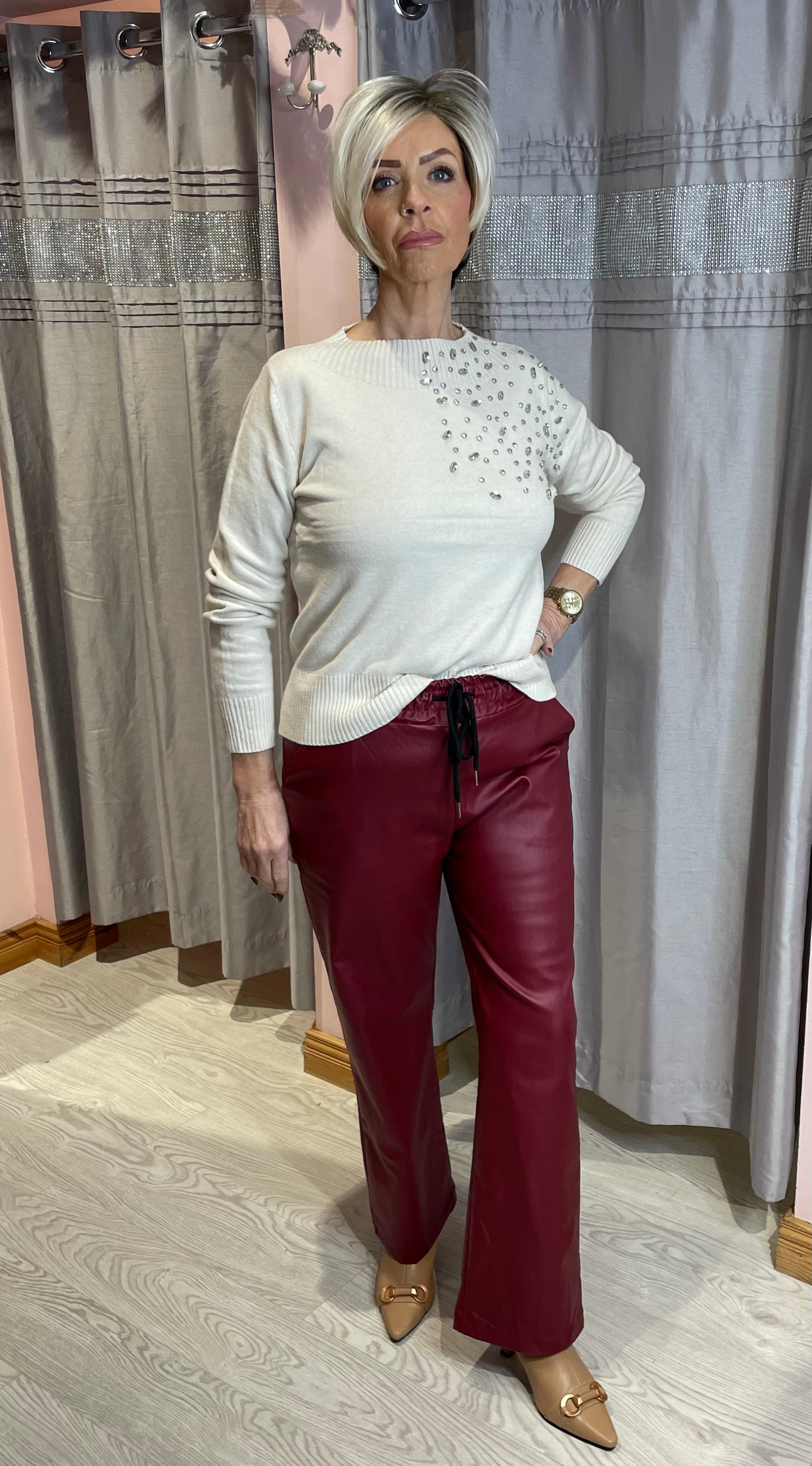 Elevate your wardrobe with our Faux Leather Wide-Leg Jeans. Crafted from soft, cruelty-free faux leather, these trousers combine comfort and style with a flattering wide-leg fit. The elasticated waist with an adjustable tie ensures a perfect fit, while the two side pockets add practical detail without compromising the sleek silhouette.