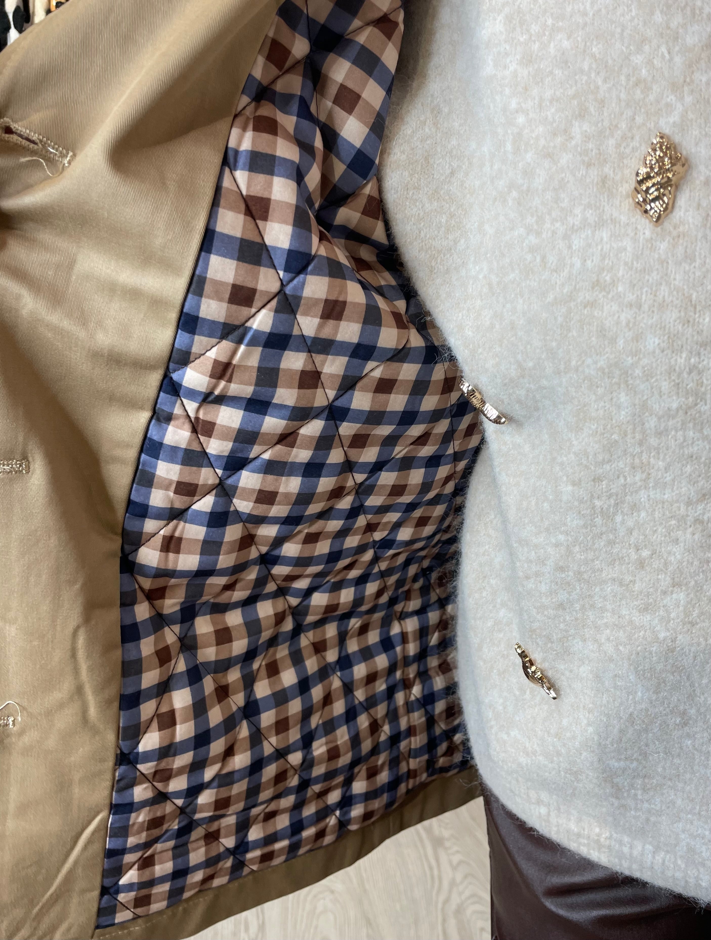 A fresh take on the timeless rain mac. Featuring a feminine fluted collar, chic 3/4 length cut, and a contrast check lining for a heritage-inspired finish. Effortlessly elegant, rain or shine.