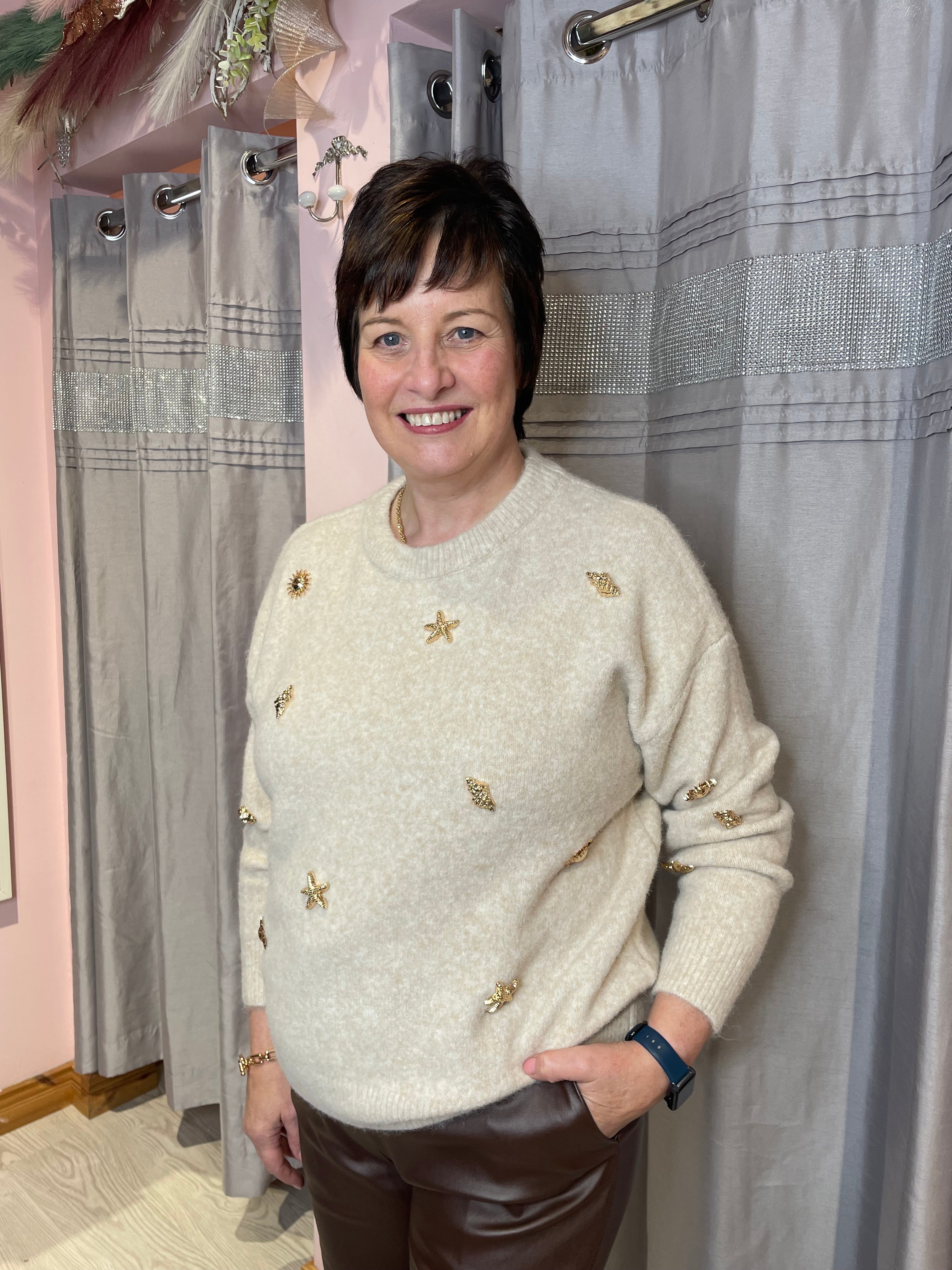 Inspired by treasures of the seashore, this refined jumper features gleaming gold hardware accents that catch the light with every movement. A timeless round neckline and soft knit make it both luxurious and effortless.
